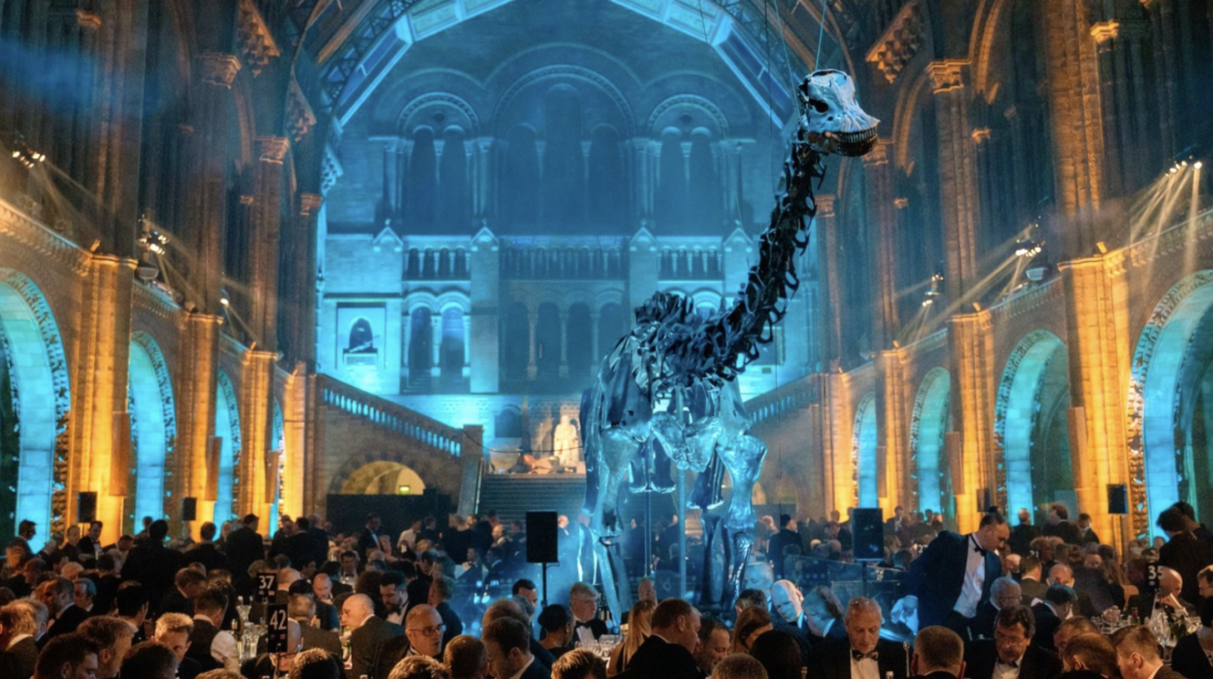 Die Säulen werden an diesem Abend golden angestrahlt, und über den Tischen für das gesetzte Essen schwebt das 25 Meter lange Skelett eines Brachiosaurus - in einem unwirklich blauem Licht, das mit dem warmen Schimmer der Säulen effektvoll kontrastiert. Hals und Kopf des Fossils brechen aus der Achse aus, der Kopf steht leicht schräg, so dass es aussieht, als schaue Brachiosaurus den Vertretern des heutigen Raubtierkapitalismus direkt in die Augen. Seine gut rekonstruierten Zähne zeigen dabei ein boshaftes Grinsen.